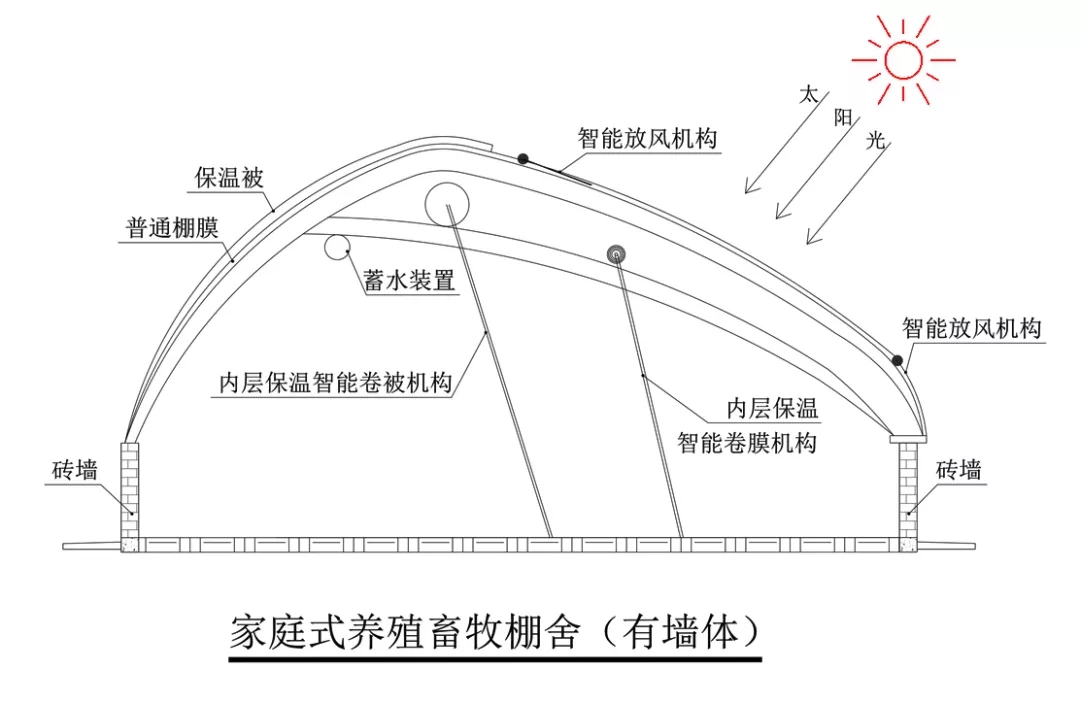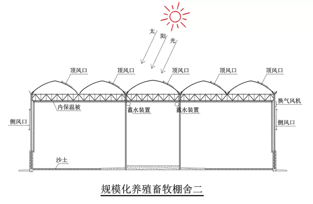 進行畜牧養殖的溫室稱為畜牧養殖溫室。配備智能控制系統的畜牧棚舍稱為智能保溫陽光畜牧棚舍。棚舍內蒙古畜牧棚舍整體采用鋼架結構,輕便耐用;四周及頂部薄膜覆蓋;后墻及頂部后坡整體覆蓋毛氈型保溫被;頂部及四周設置通風口;棚舍內部在頂部及四周有保溫被;桁架上方設置接滴露薄膜及導流槽;內部設置一地下水池,供牛羊飲水。為節約投資可連棟使用。特別適用于大型畜牧養殖企業,單棟適用于大跨度不同禽類的單獨養殖。